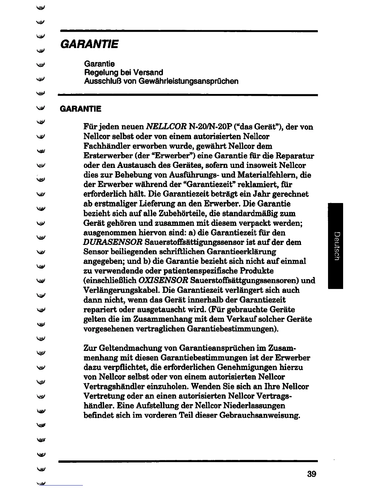 Nellcor N-20 - Garantie; Regelung bei Versand Ausschluss von Gewahrleistungsanspruchen