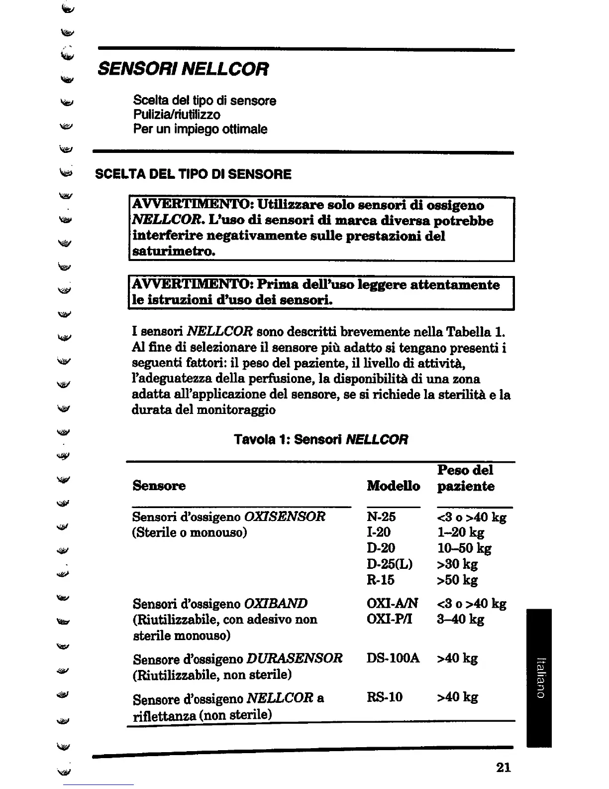 Nellcor N-20 - Scelta del Tipo DI Sensore