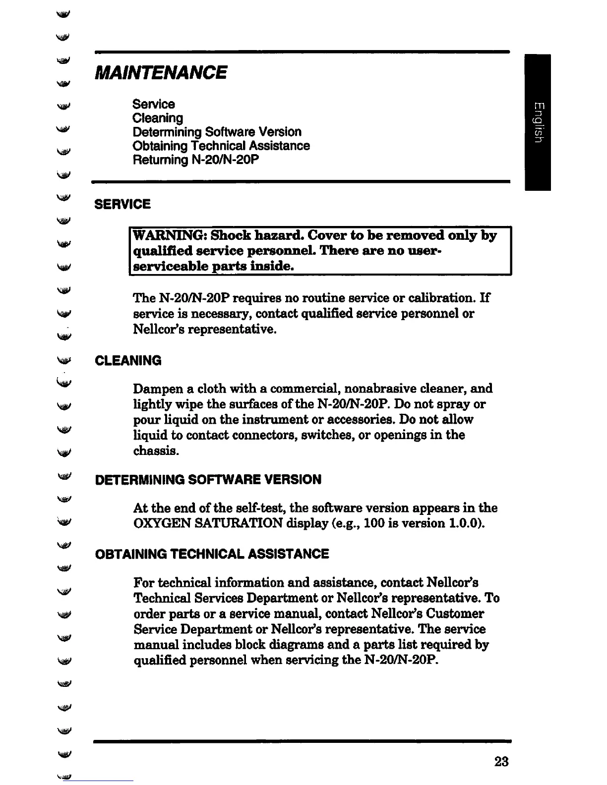 Nellcor N-20 - Maintenance; Service; Cleaning; Determining Software Version