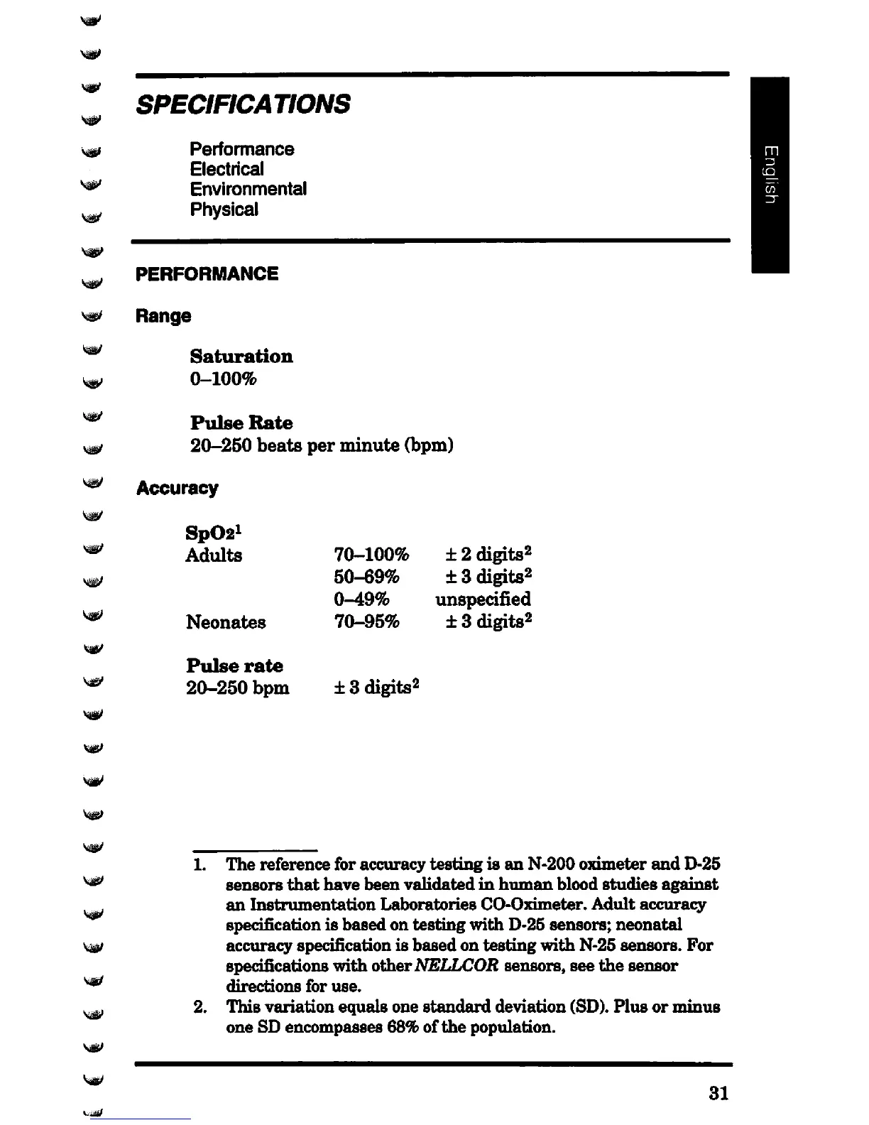 Nellcor N-20 - Specifications; Performance