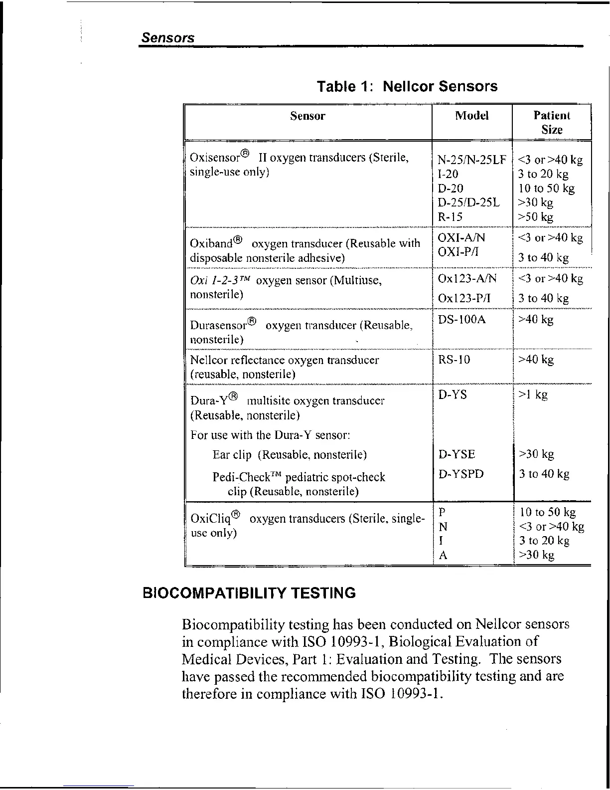 Bioco~npatibility testing has been conducted on Nellcor sensors