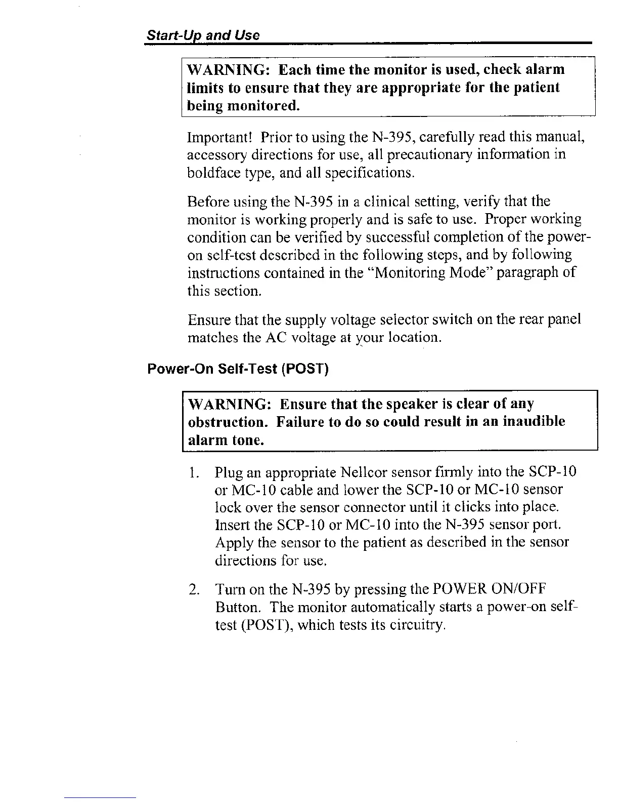 WAWING: Each time the monitor is used, check alarm