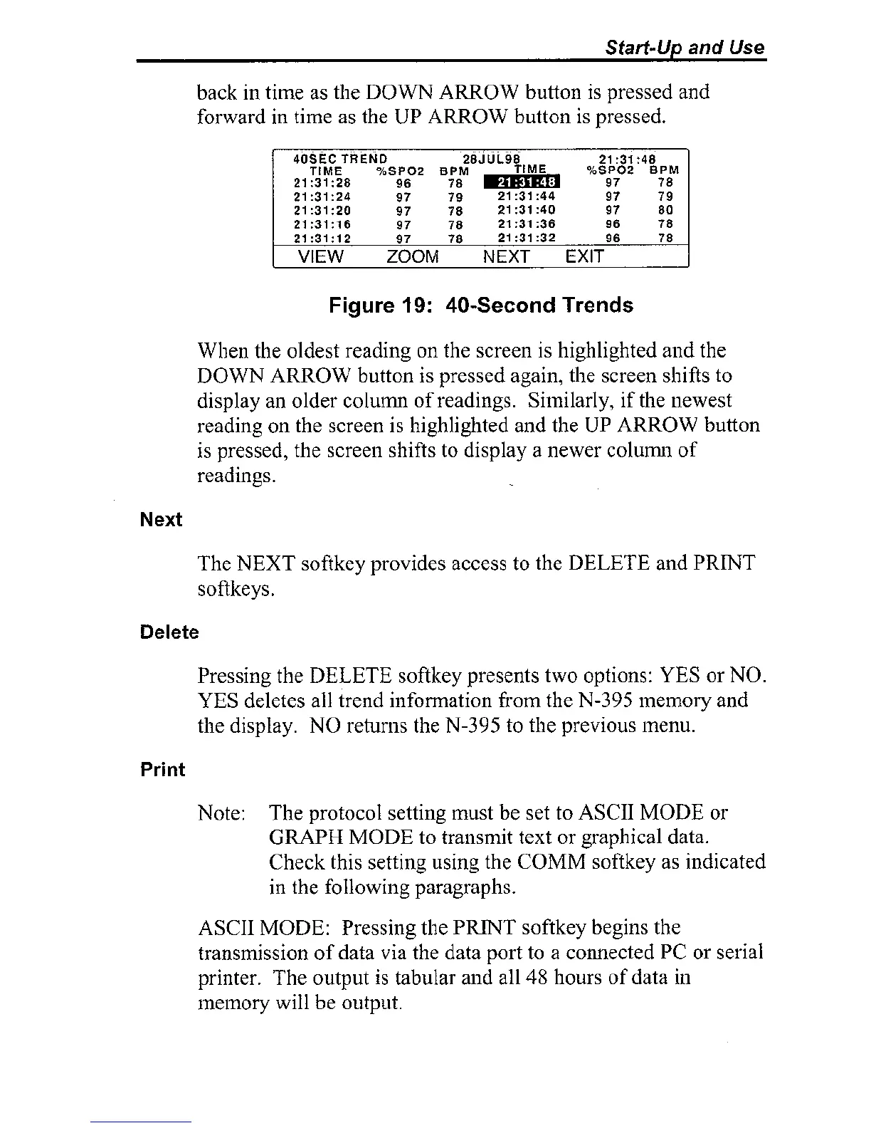 The NEXT softkey provides access to the DELETE and PRINT