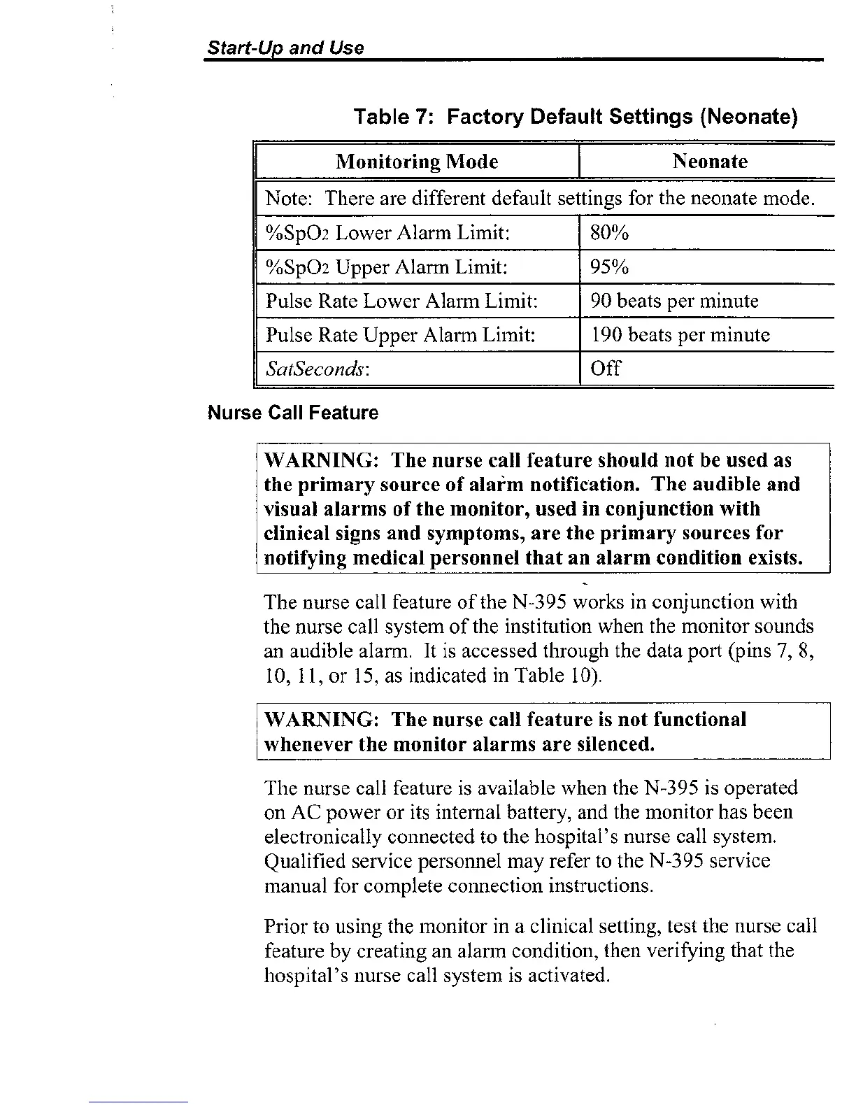 WARNING: The nurse call feature should not be used as