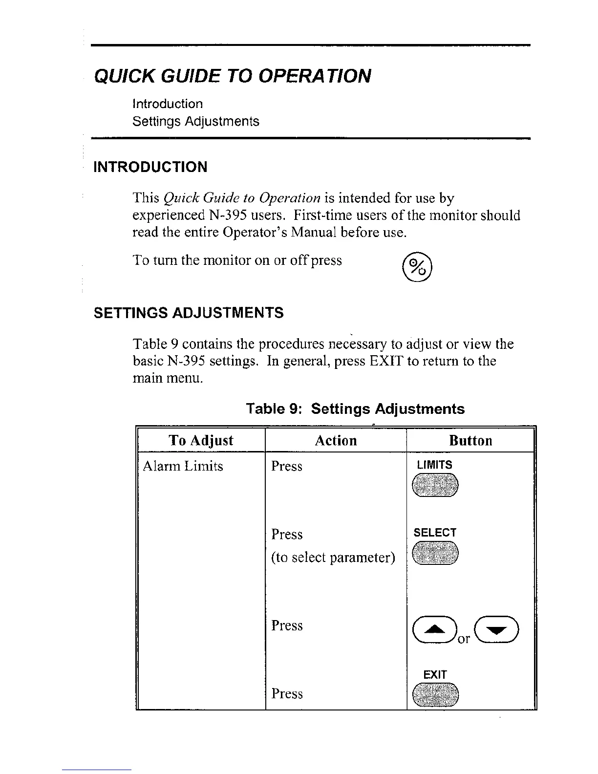 Nellcor N-395 - Quick Guide to Operatbn; Introduction; Settings Adjustments; Table 9: Settings Adjustments