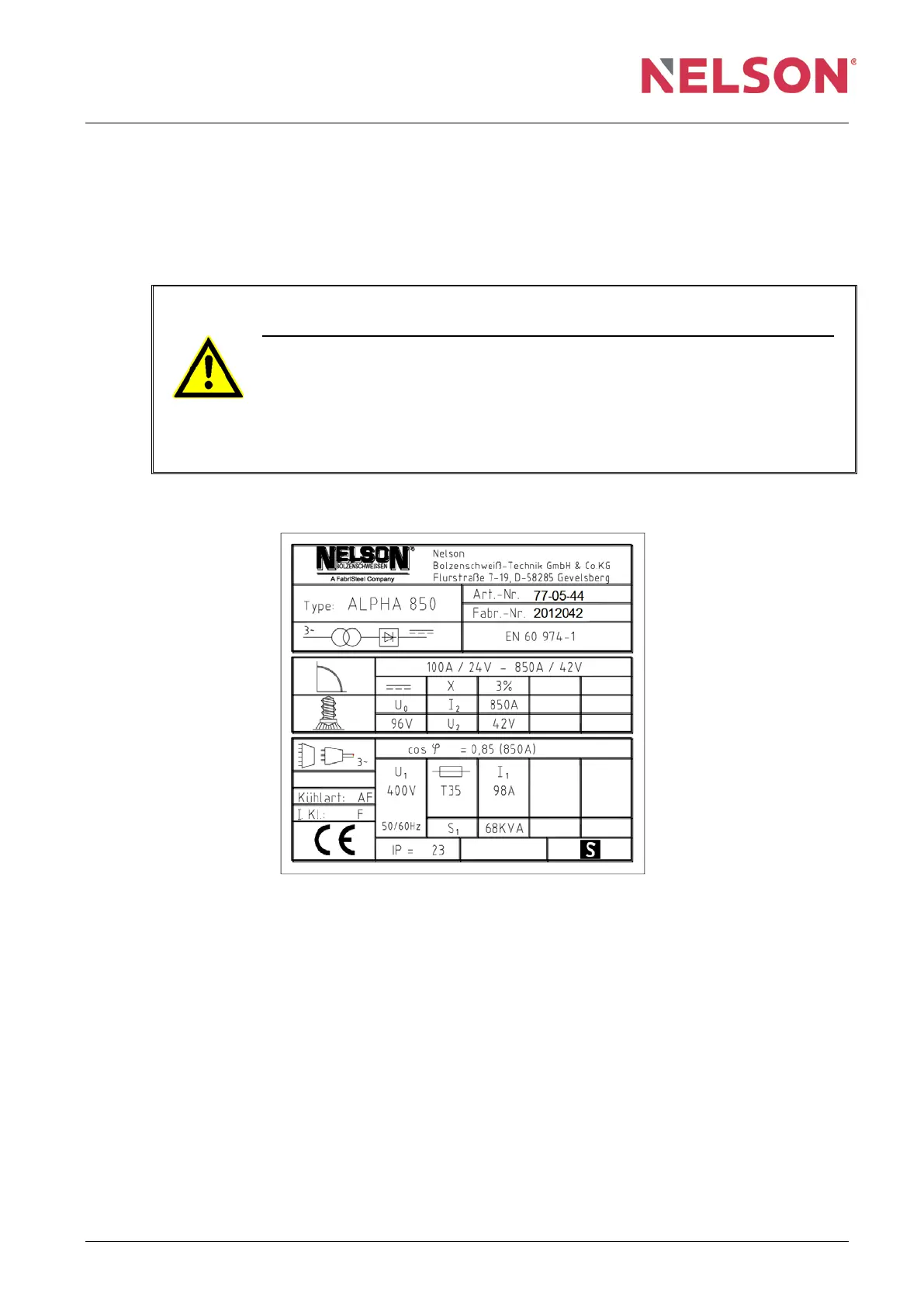 The power supply values are marked on the ALPHA 850 type plate: