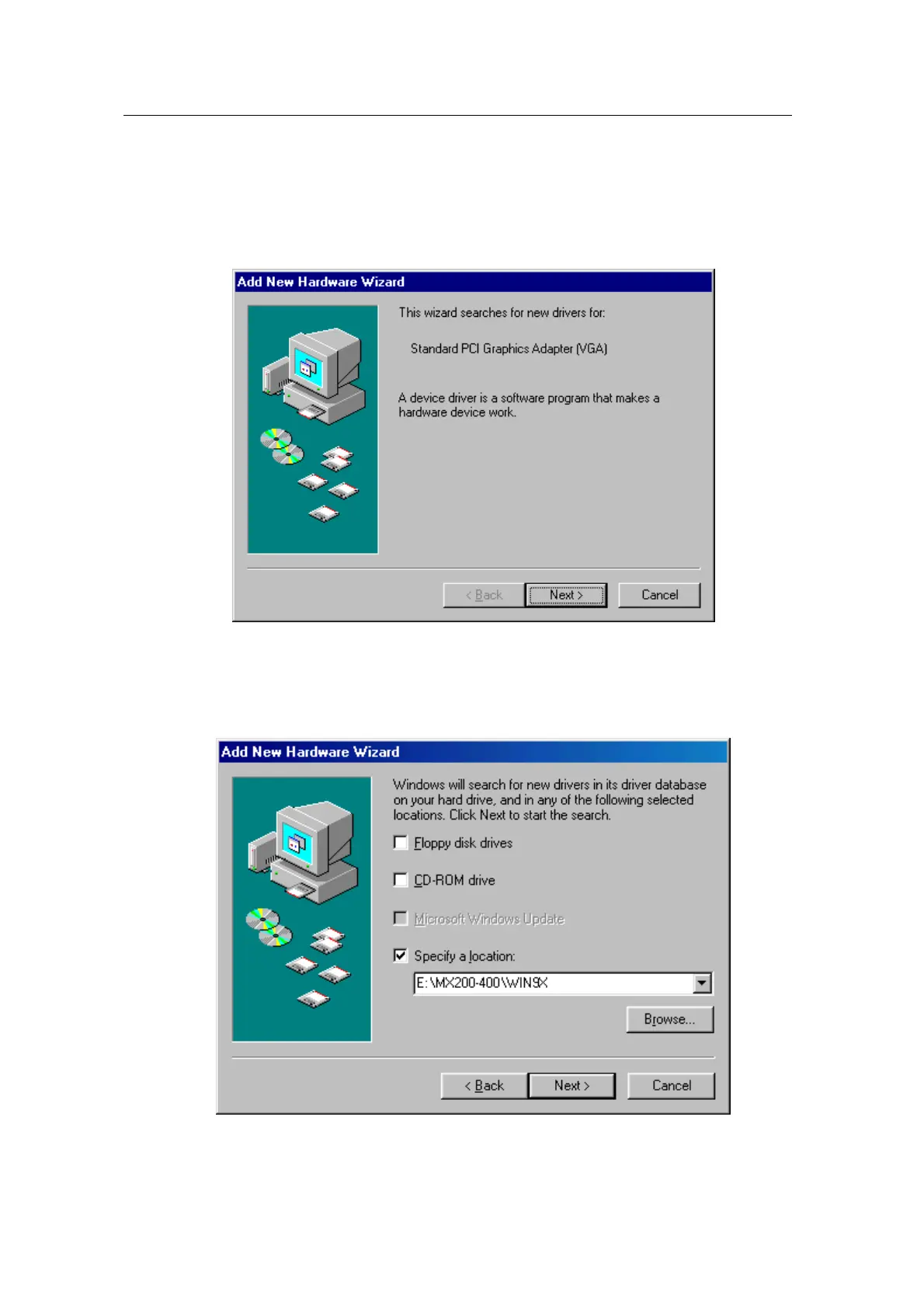 3. Select “Specify a location” and “WIN9X” folder on “MX200-400” folder of CD-ROM drive