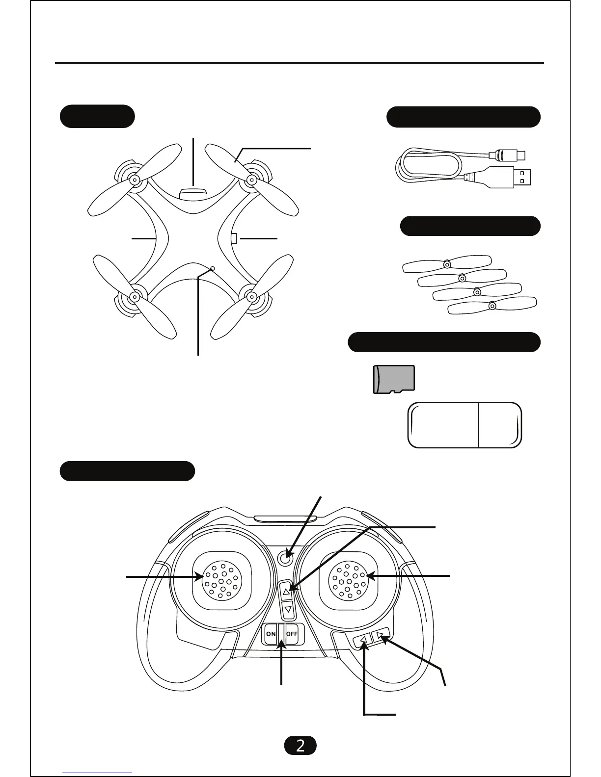 Nemo Spy drone - Parts Overview; Drone Components; USB Charger and Accessories; Transmitter Overview