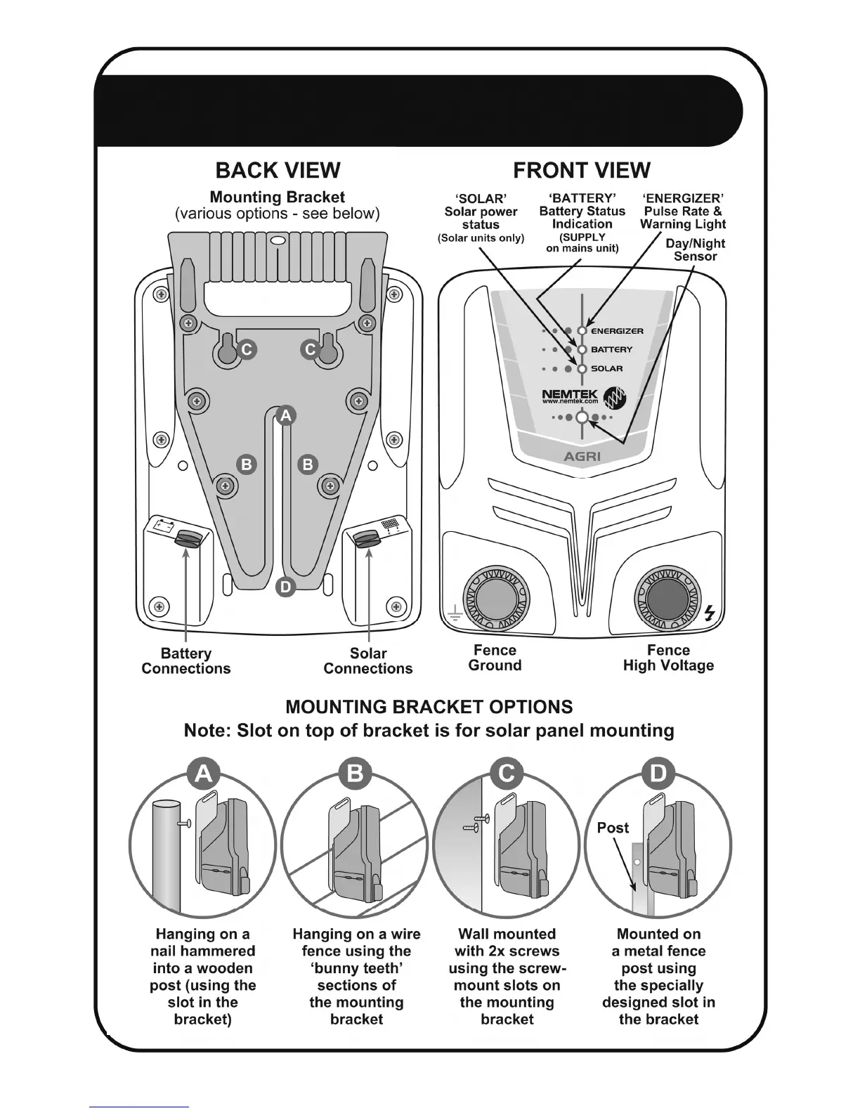 Nemtek AGRI - Energizer Details and Mounting; Energizer Back View; Energizer Front View; Mounting Bracket Options