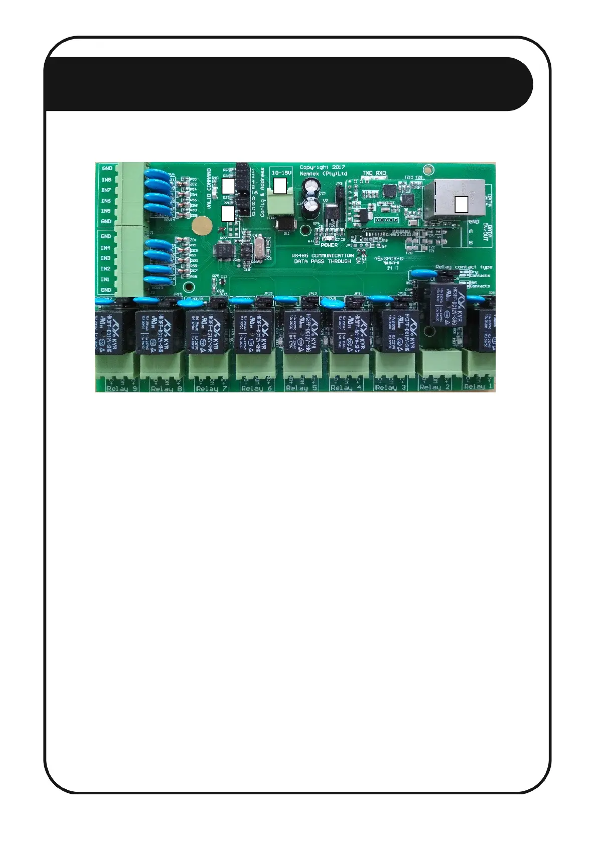 address will be 1 + 1 + 4 + 8 = 14. The first relay board in the network MUST be configured as