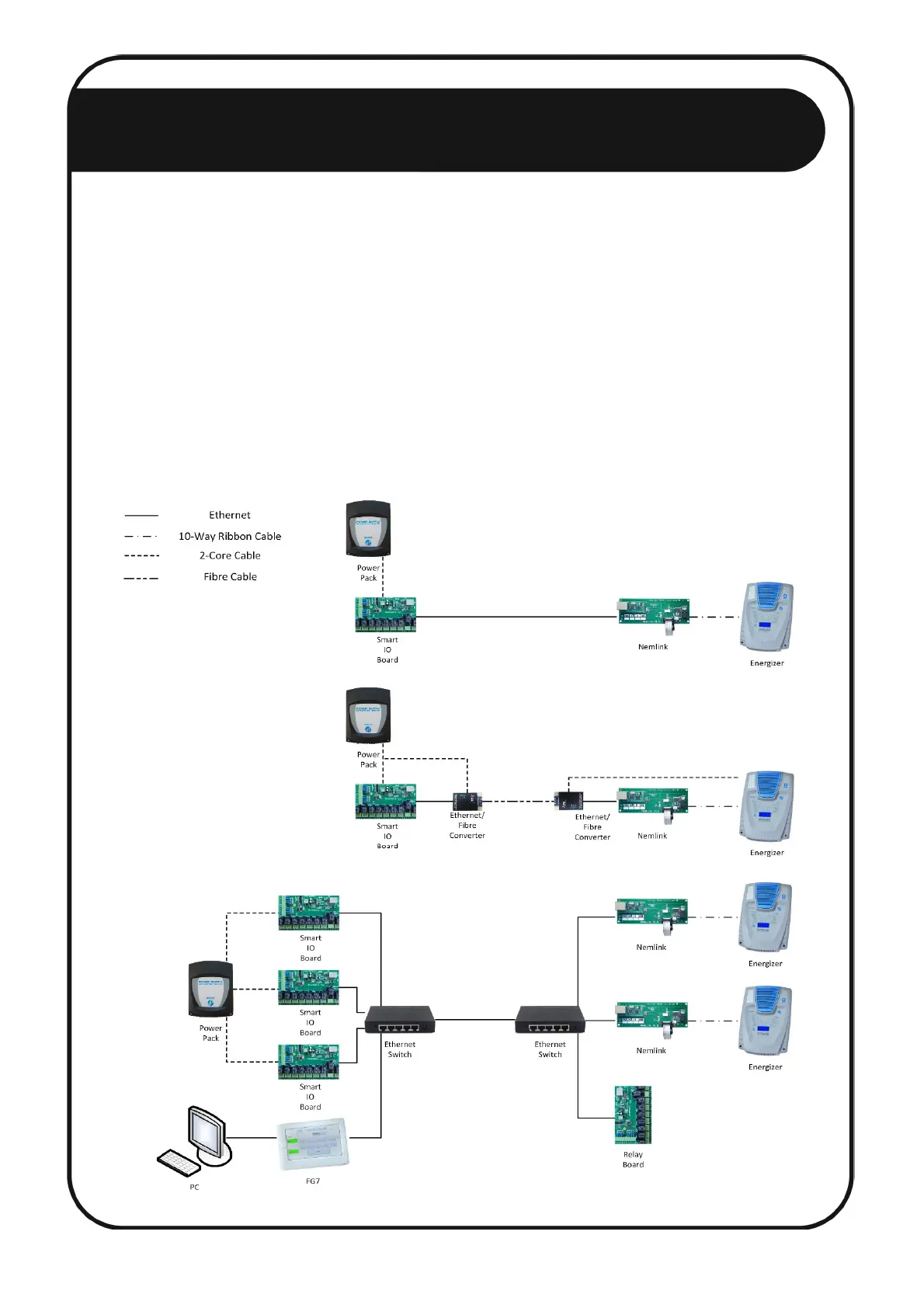 application. The figure below shows the possible connections. Although the boards and energizers are