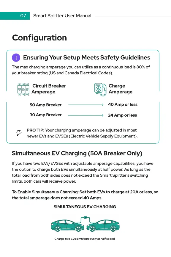 To Enable Simultaneous Charging: Set both EVs to charge at 20A or less, so