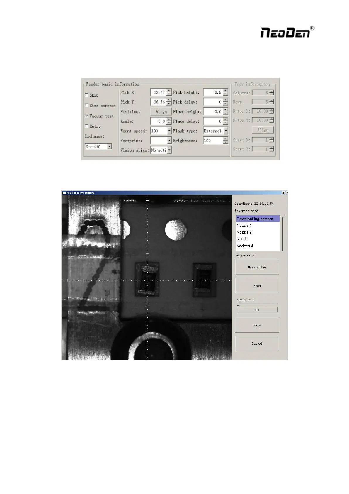 1) Firstly click the “Align” under “Position” function, camera will lock the component position on the feeder,