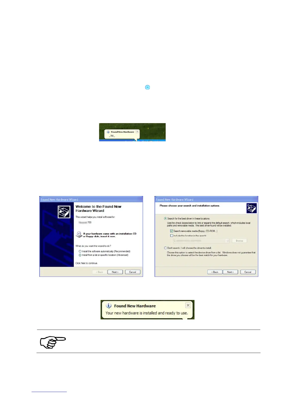 • Follow the steps of the New Hardware Wizard of Windows XP/Vista