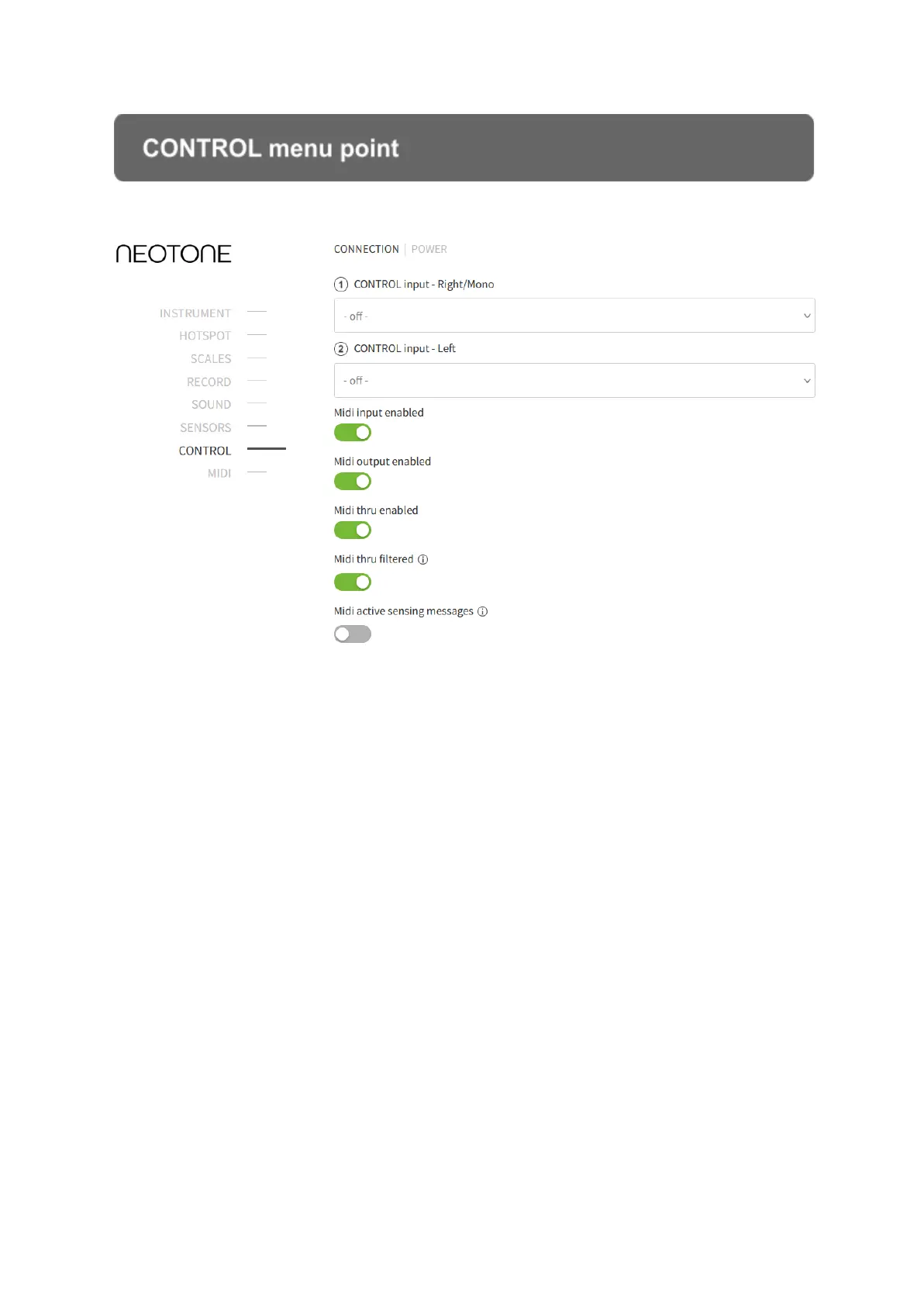 At this menu point the NEOTONE instrument’s main technical features can be