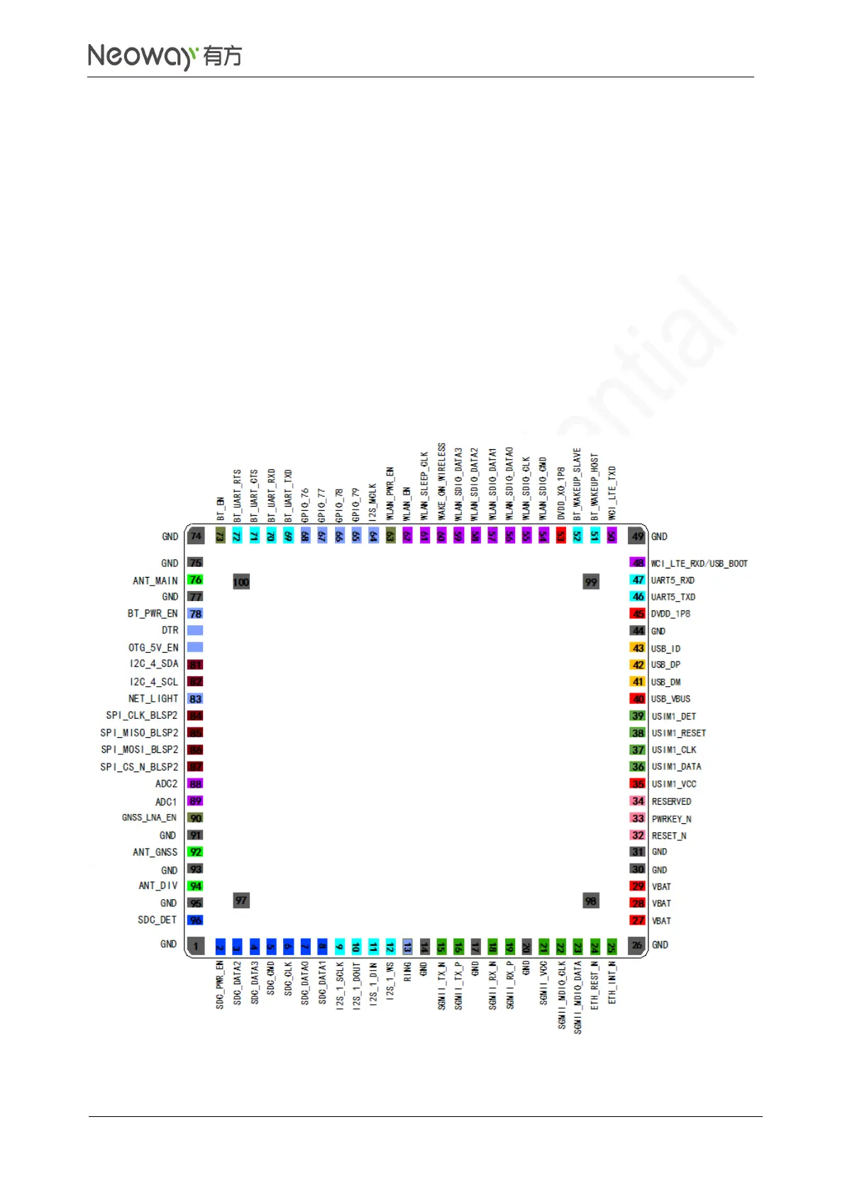 Neoway N75 - 2 Module Pins; Pad Layout; Figure 2-1 N75 Pin Definition (Top View)