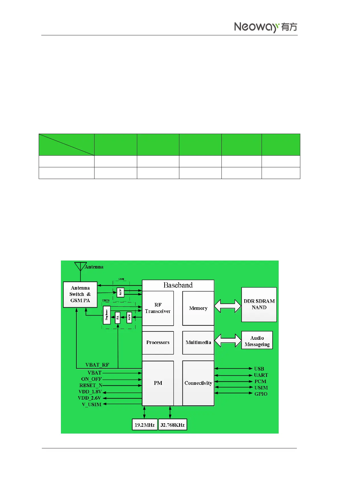WM620 module consists of power supply management, baseband controller, MCP, power amplifier (PA),