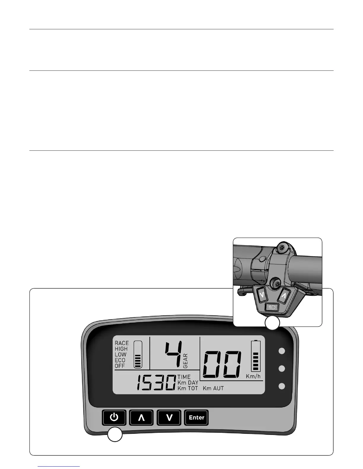 o button on display (1) together with lights button (2) placed near the left handlebars.