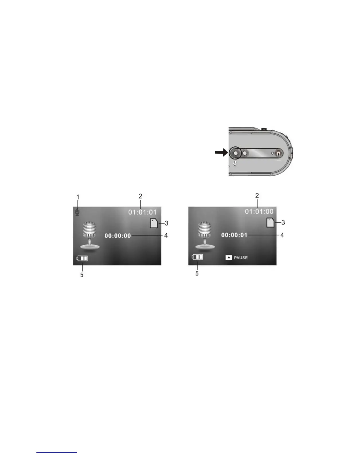 1 Indicates voice record mode 2 Indicates remaining time 3 Indicates Memory card