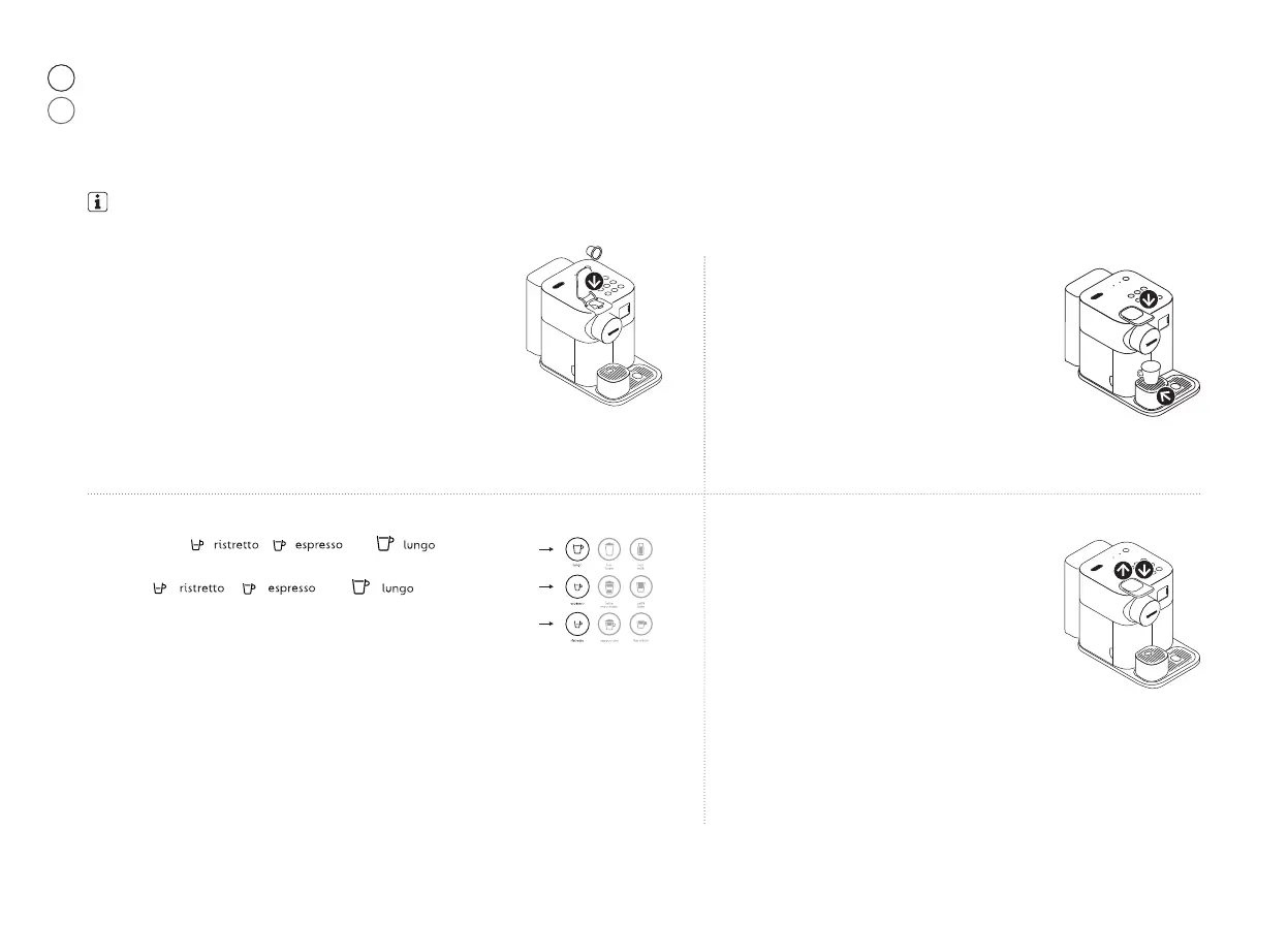 ❶ 1. Angkat tuil sepenuhnya dan masukkan kapsul. ❷ 2. Tutup tuil dan letakkan cawan di bawah saluran kopi.