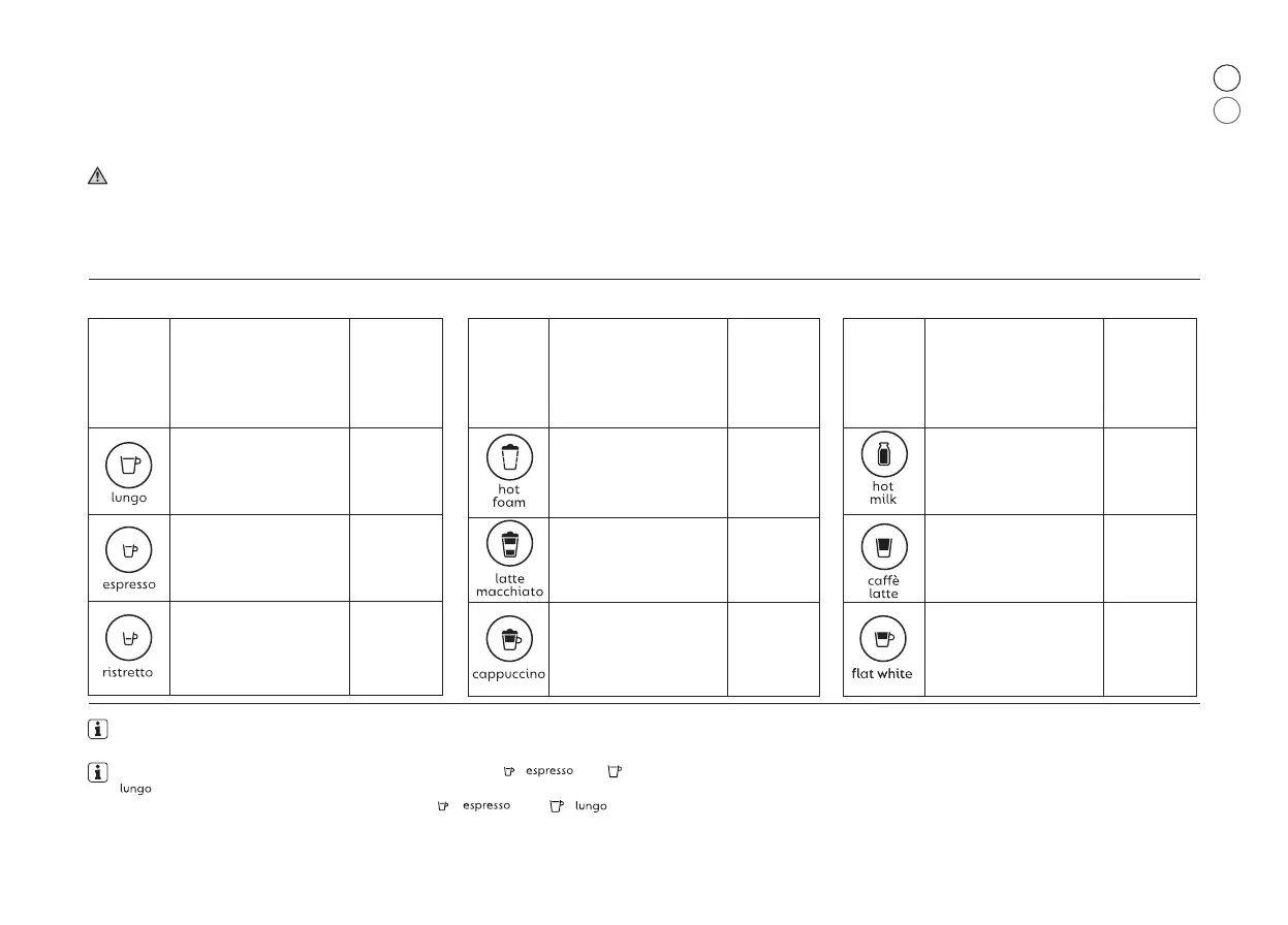 1. สามารถตั้งโปรแกรมปริมาณของกาแฟได้ตั้งแต่ 15 ถึง 130 มล.หมายเหตุ: ปริมาณฟองนมจะขึ้นอยู่กับชนิดของนมที่ใช้ และอุณหภูมิของนม