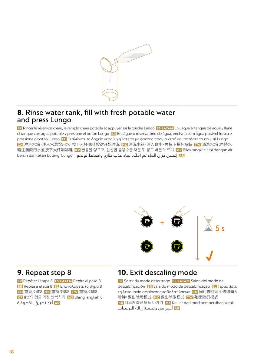 FR Rincer le réservoir d’eau, le remplir d’eau potable et appuyer sur la touche Lungo ES LATAM Enjuague el tanque