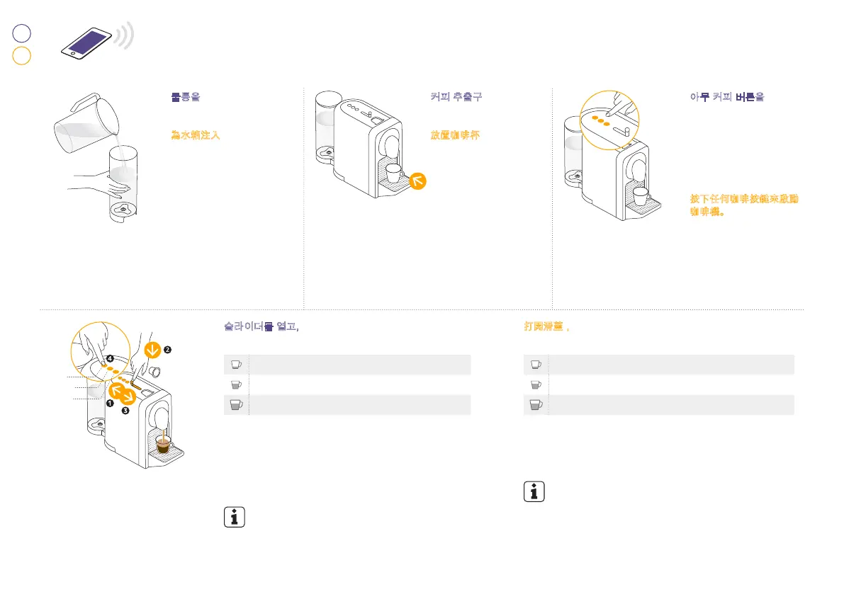 為水箱注入飲用水。 放置咖啡杯於咖啡出口