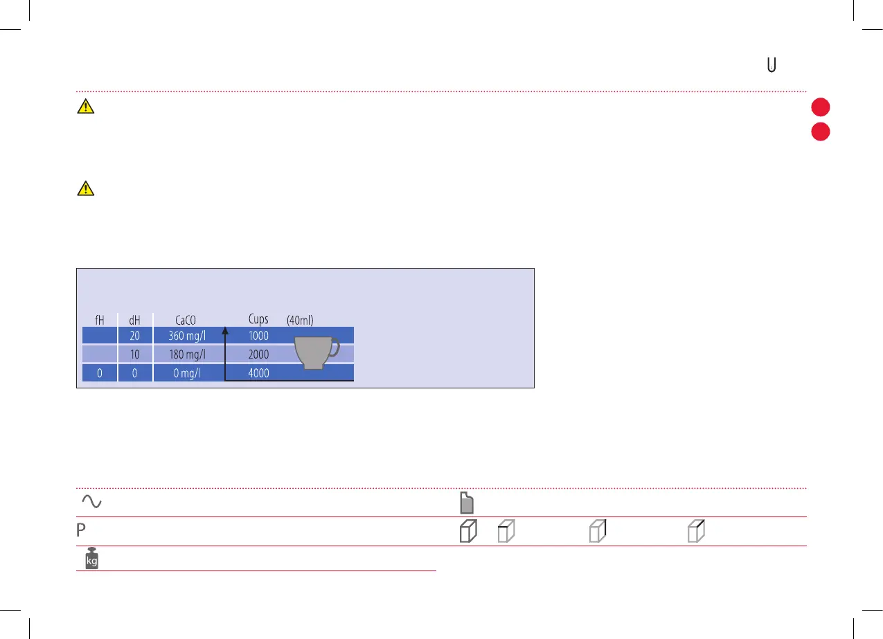 beskadige maskinen. Følgende tabel viser den krævede afkalkningshyppighed for at opnå bedst mulig ydelse af maskinen, baseret på vandets hårdhed. Hvis du har yderligere spørgsmål omkring afkalkning,