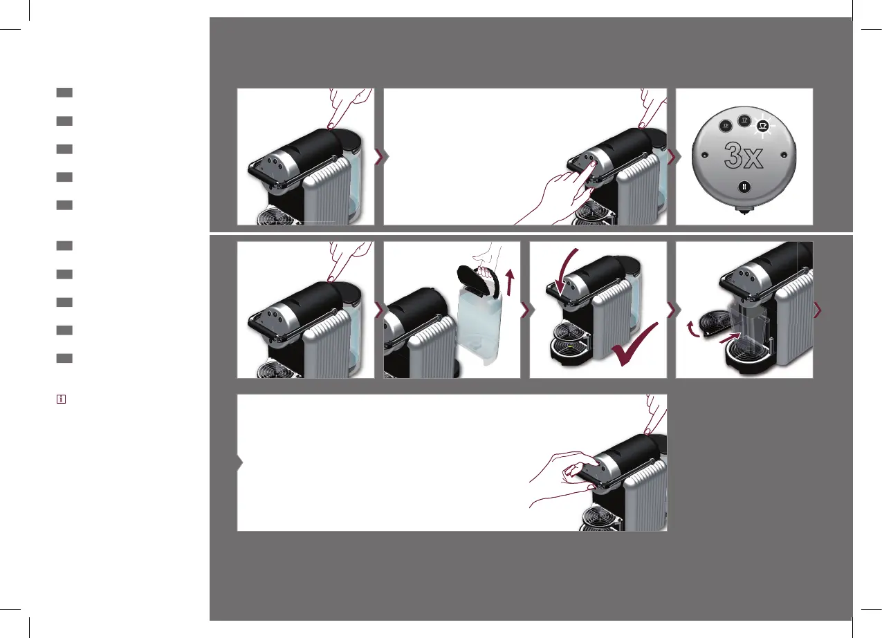 當啟動咖啡機時,同時按著濃縮咖啡與熱水按鈕。咖啡