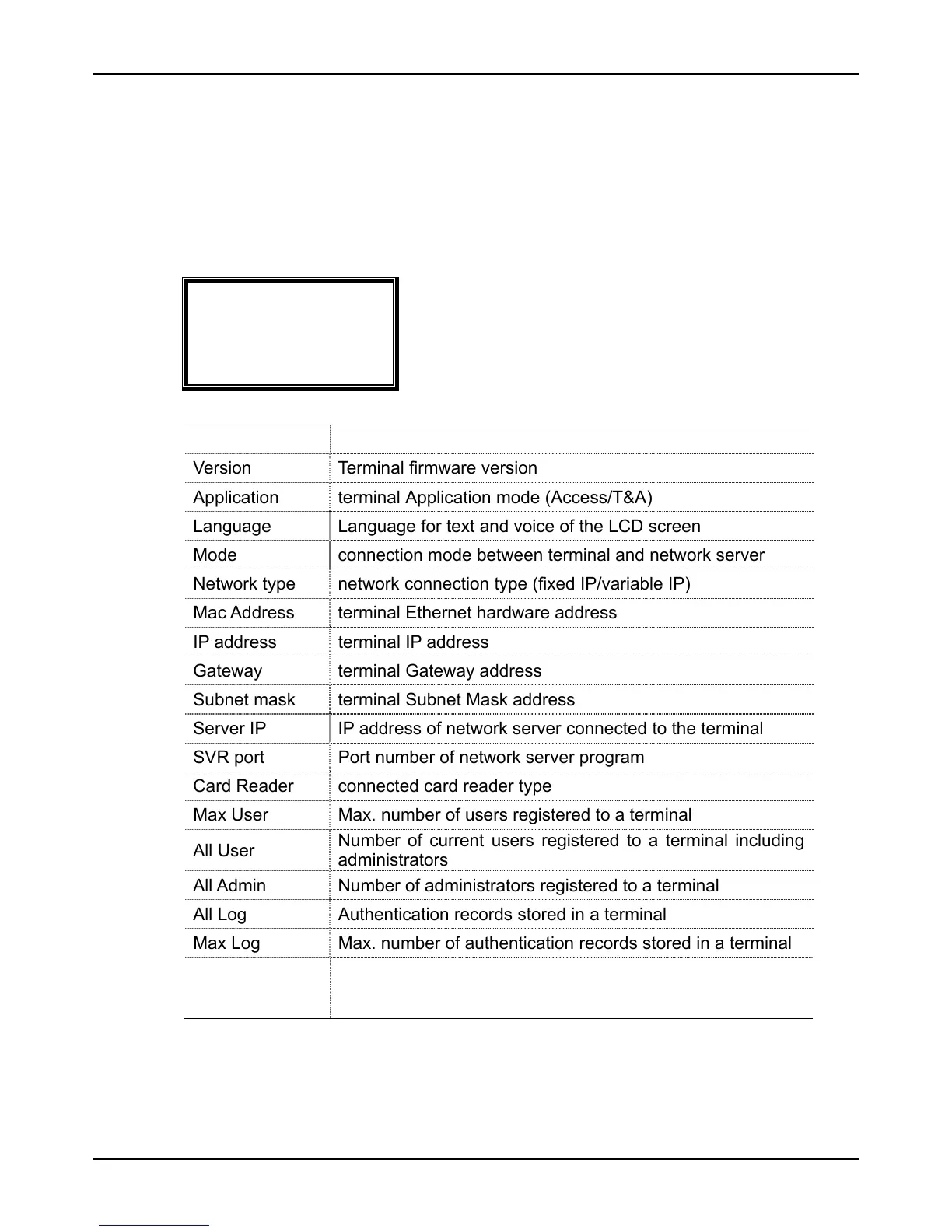 In the main menu, press [4] to select “4.Terminal info” and the following screen