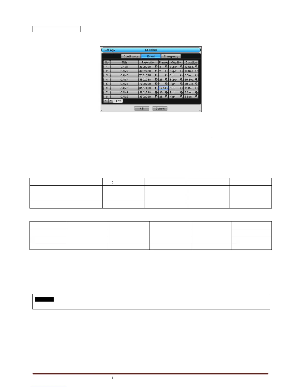 Resolution column to select recording resolution of a corresponding camera. User may select one