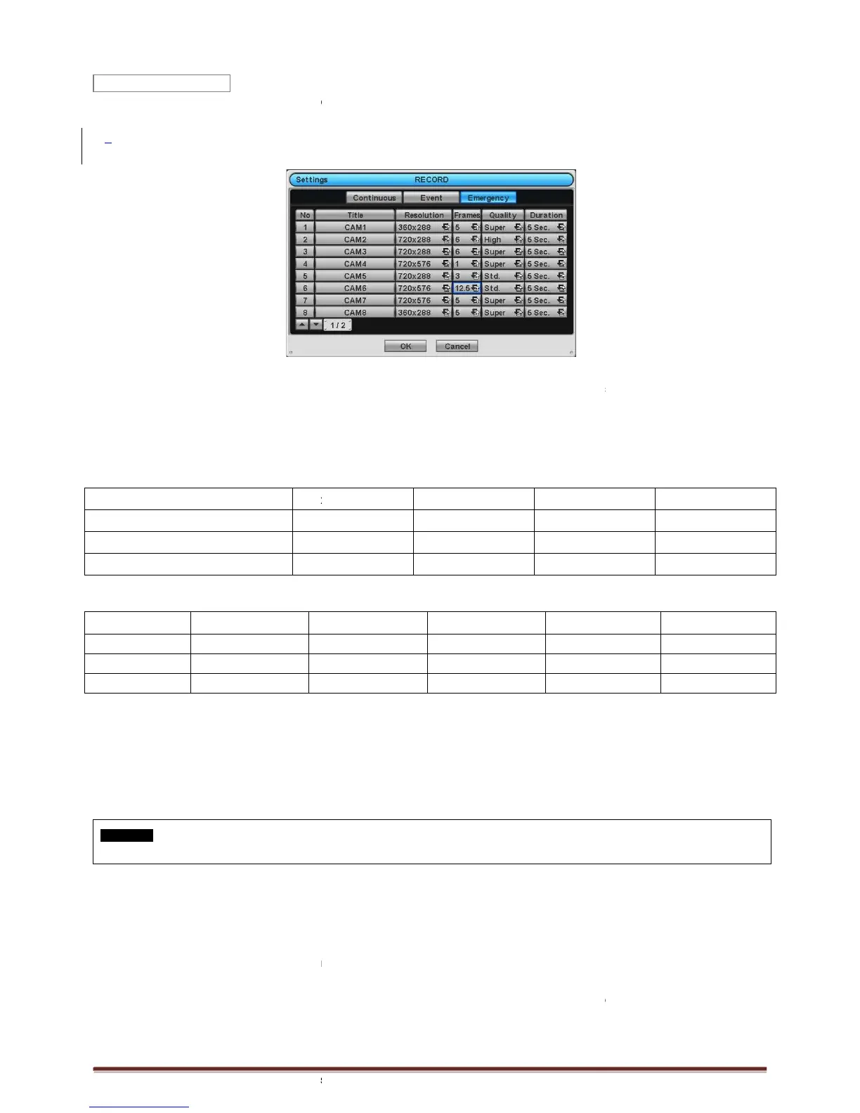 Resolution column to select recording resolution of a corresponding camera. User may select one