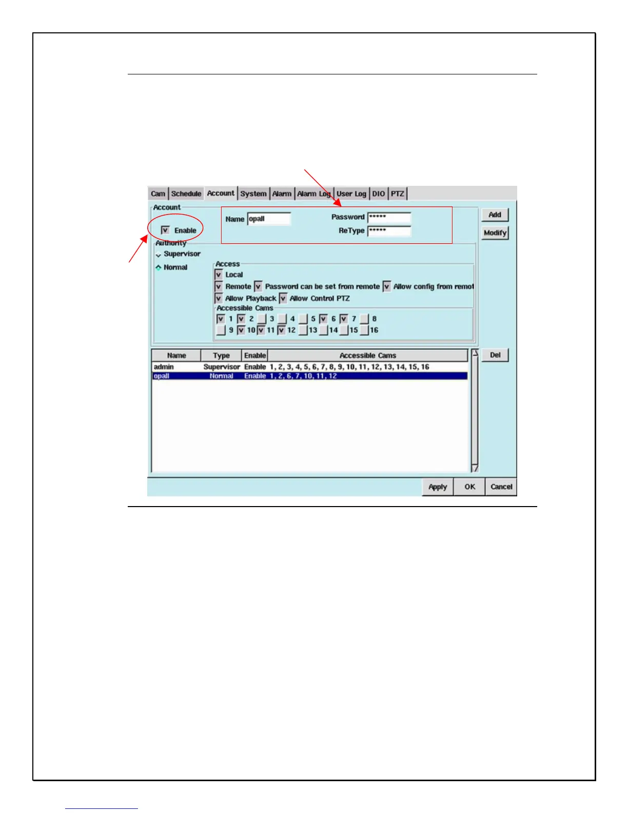 6. Select “ Supervisor “ to give a user total control over the DVR or “ Normal” to limit the