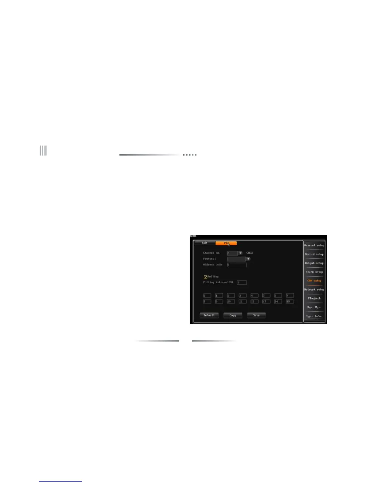 l Enter the “PTZ Setup” interface to set protocol and address code (The default PTZ address code is coincide with every channel, for instance, the