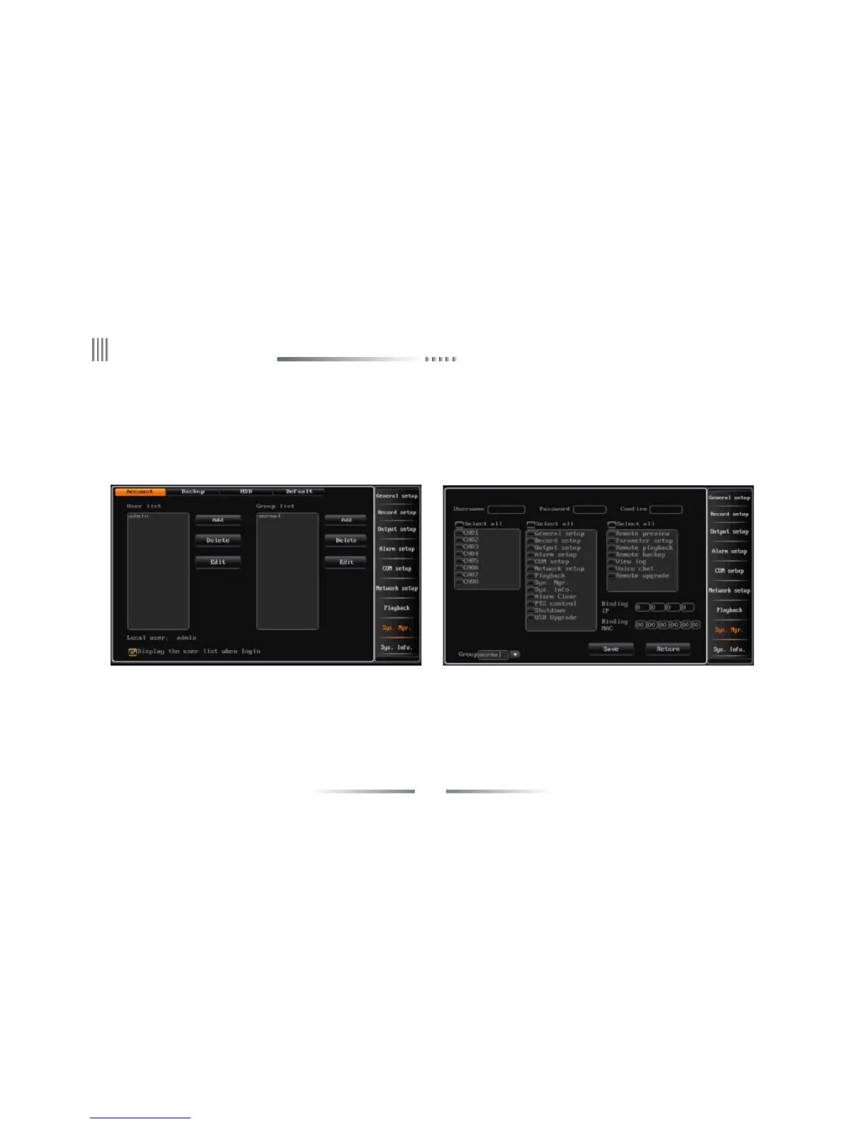 l Display the user list when login: When login the DVR, use the “+”, “-” on the remote controller or click the wheel of the mouse to select the user;