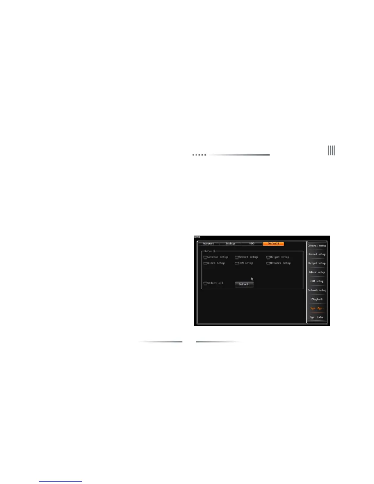Note: Network IP and port, System time, user account and hard disk management wouldn’t be restore default when do this operation.System