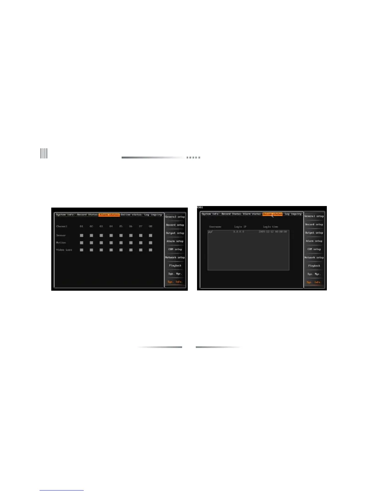 It displays the information of outer PC which connected to DVR. Such as: IP address, login/off time.The interface is the right figure above: