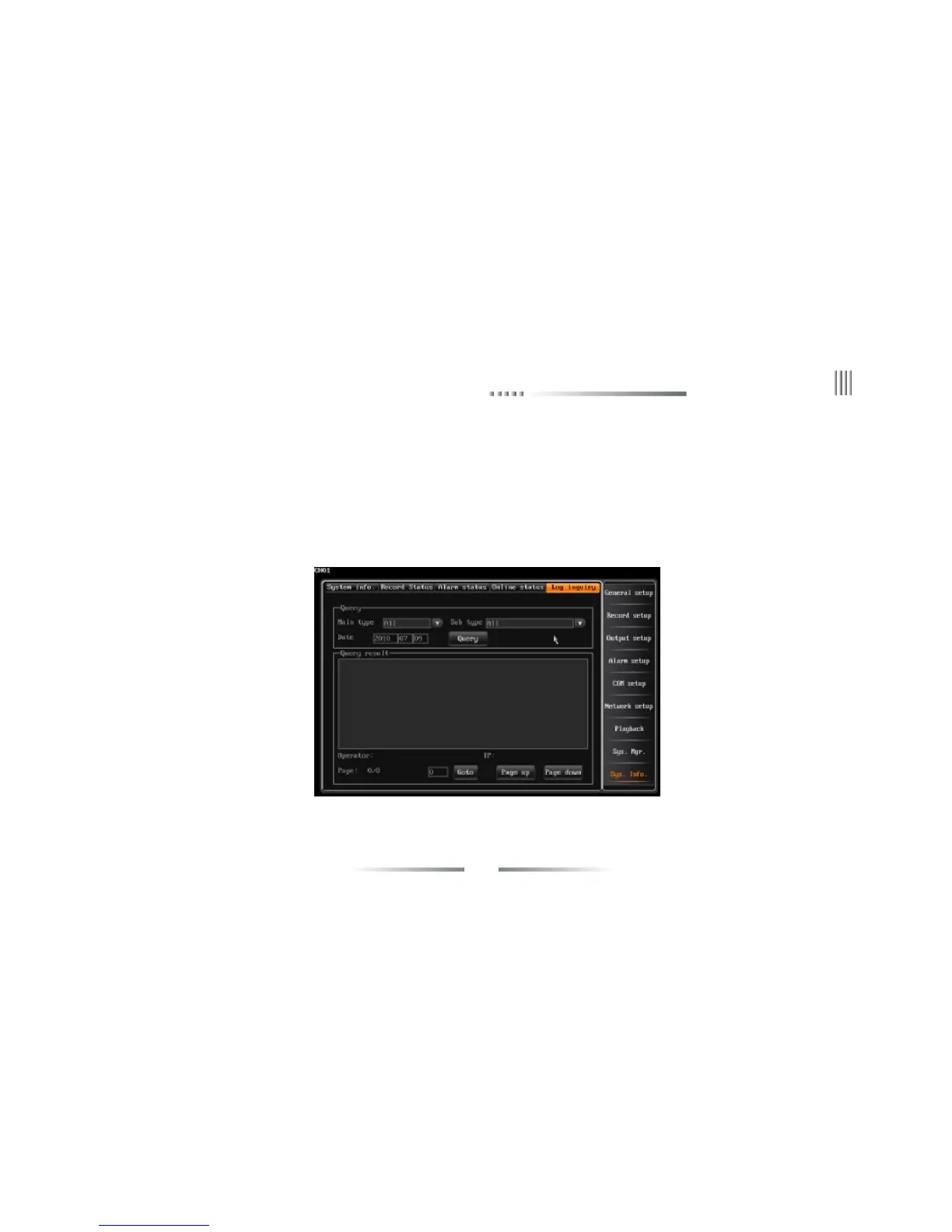 l At the bottom of log information interface will display page No., user can click page up/down to check (The number of the log item is no limited).