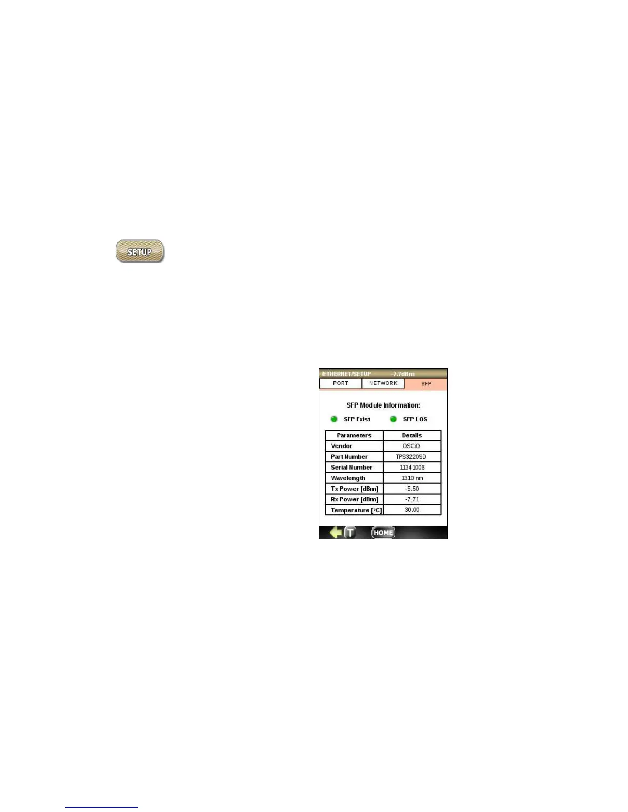 Press the SETUP button configure the Test Port, Network Setting and display SFP information.