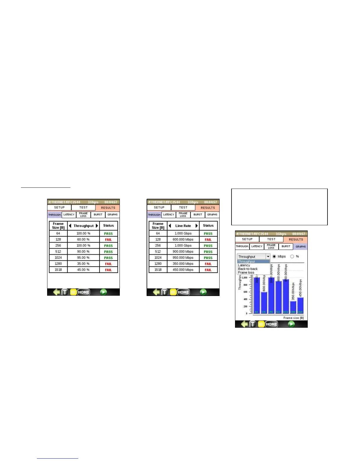 PASS/FAIL status. Each test type THROUGHput, LATENCY, FRAME LOSS and BURST is displayed below.