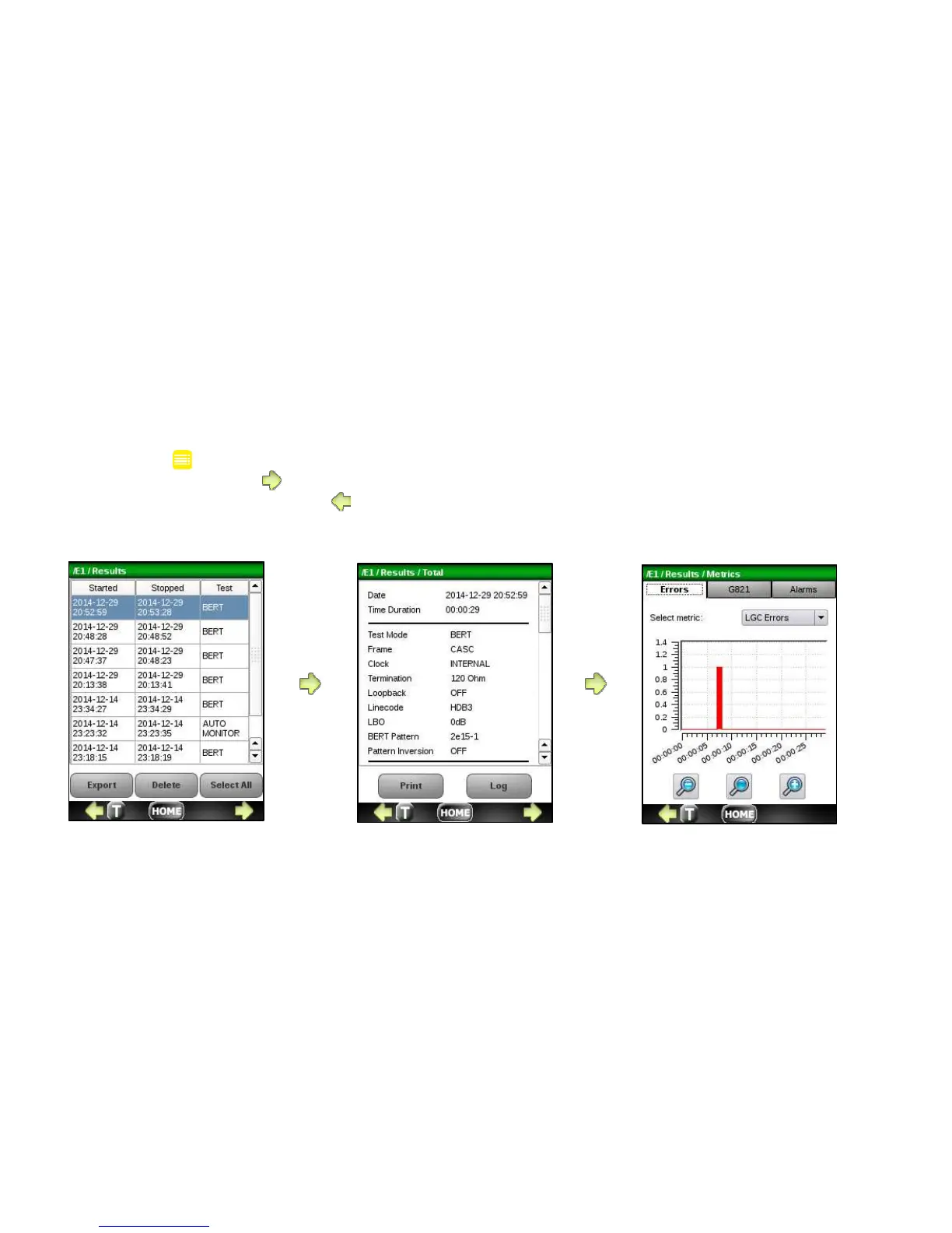 The Test Results menu shows a log of all results for the application currently in use. To view details, highlight the