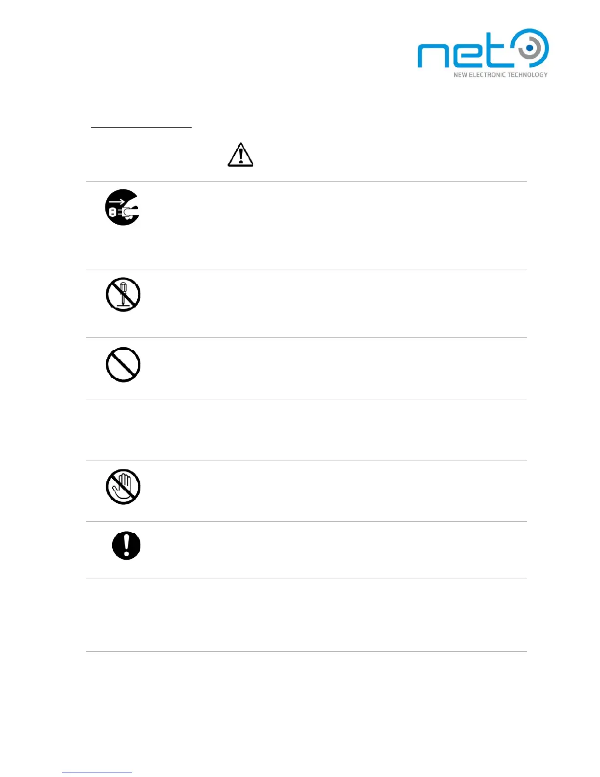 Do not disassemble, repair, or modify the equipment. Otherwise, fire or electric shock