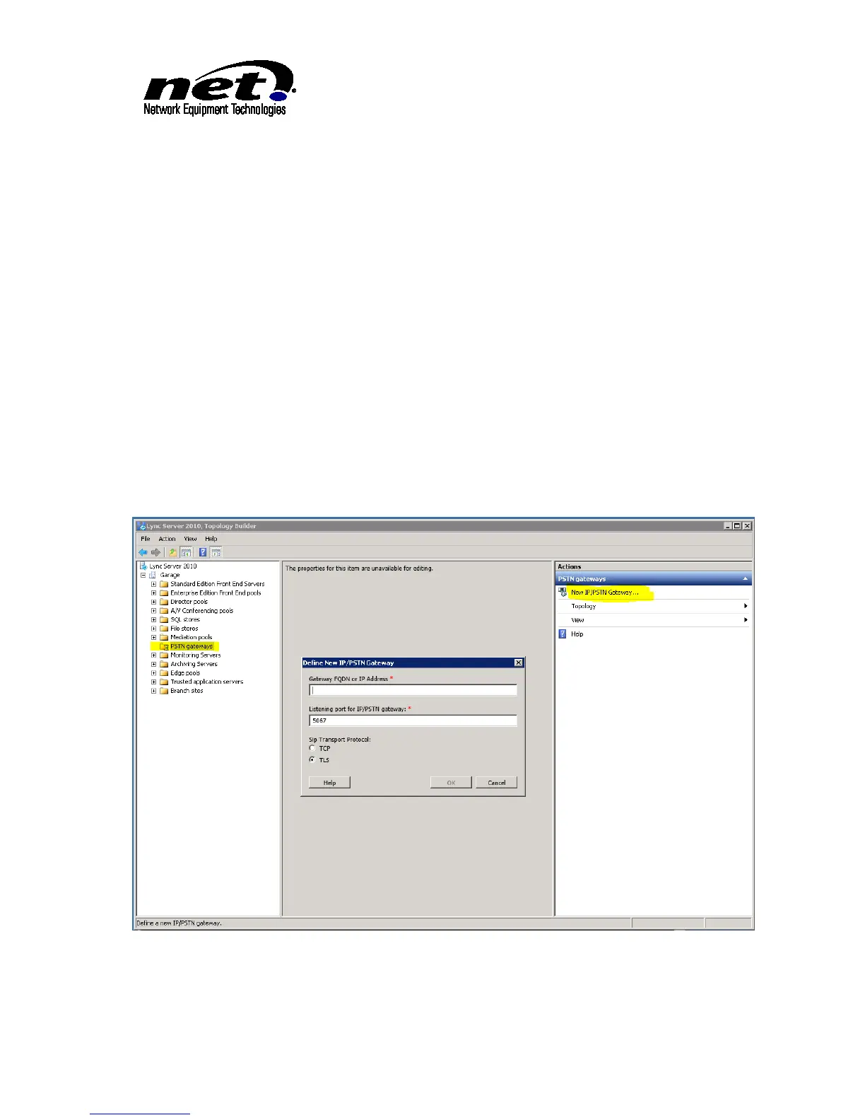 ‘PSTN Gateways’ link in the left hand pane. This will provide the link in the right hand pane ‘New IP/PSTN
