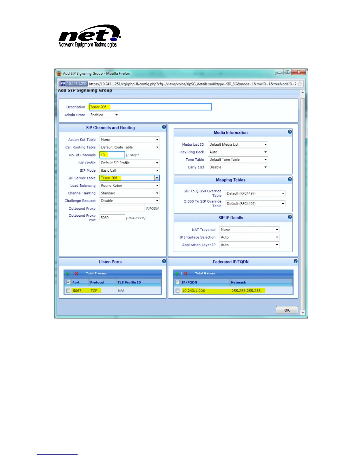 Figure 43 SIP SG Configuration Dialog