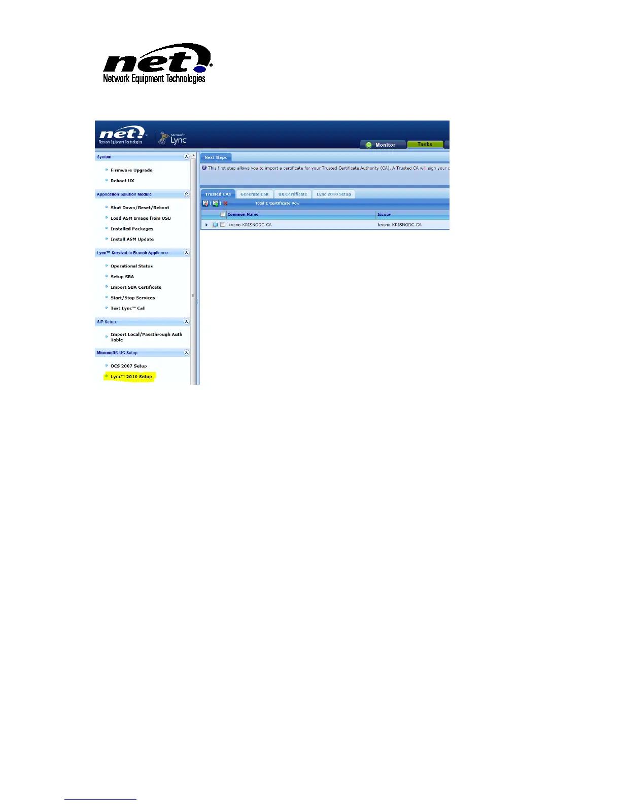 Using the web browser navigate to the Task tab and click on the ‘Microsoft UC Setup/Lync 2010 Setup’