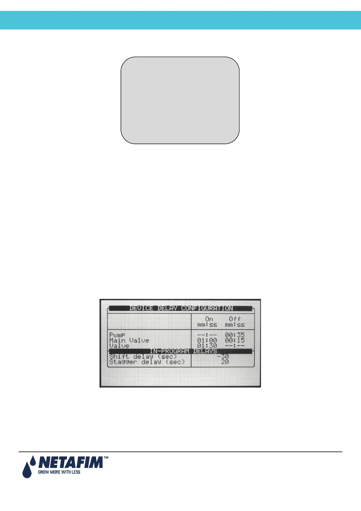 The Device Delay Configuration screen enables defining the startup and shutdown order of the irrigation process.