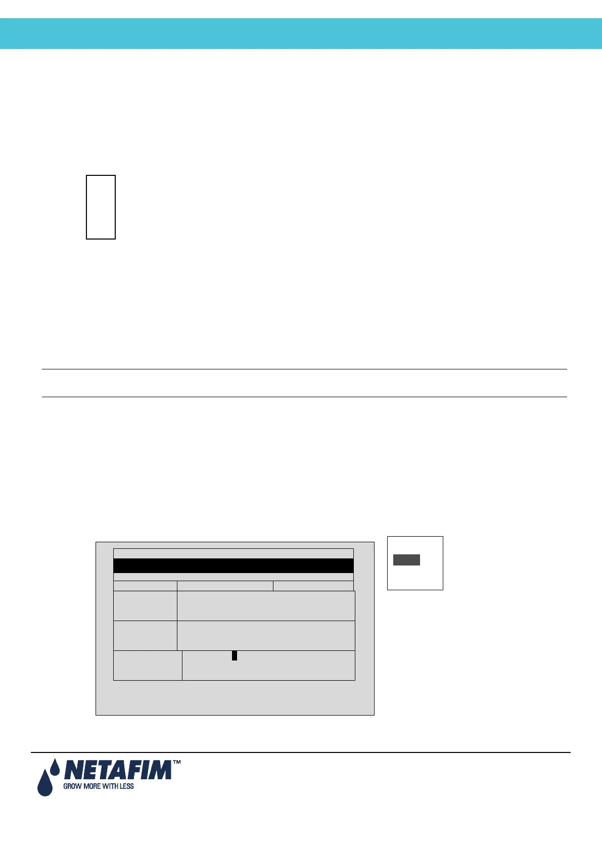 Select Dose, Water or None and press ENTER. ‘Dose’ means Fertigation (water + dosing), ‘Water’ means