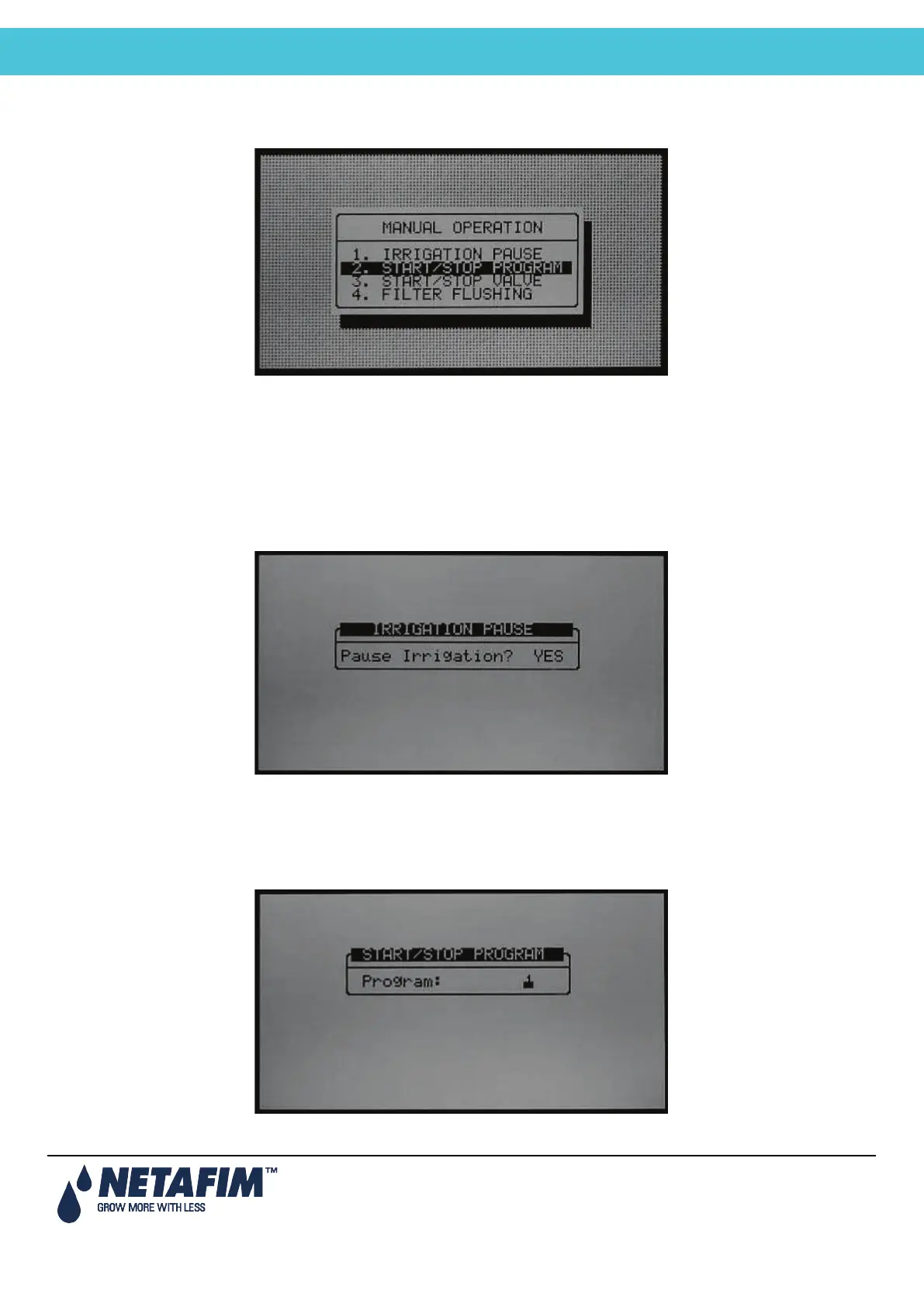 • Pause Irrigation (Yes/No): Set Yes and press Enter to confirm; all irrigations will be paused until the value