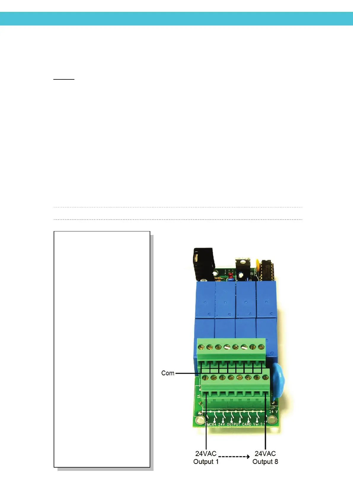 The 24VAC output card is used to drive devices that require a 24VAC power supply. The