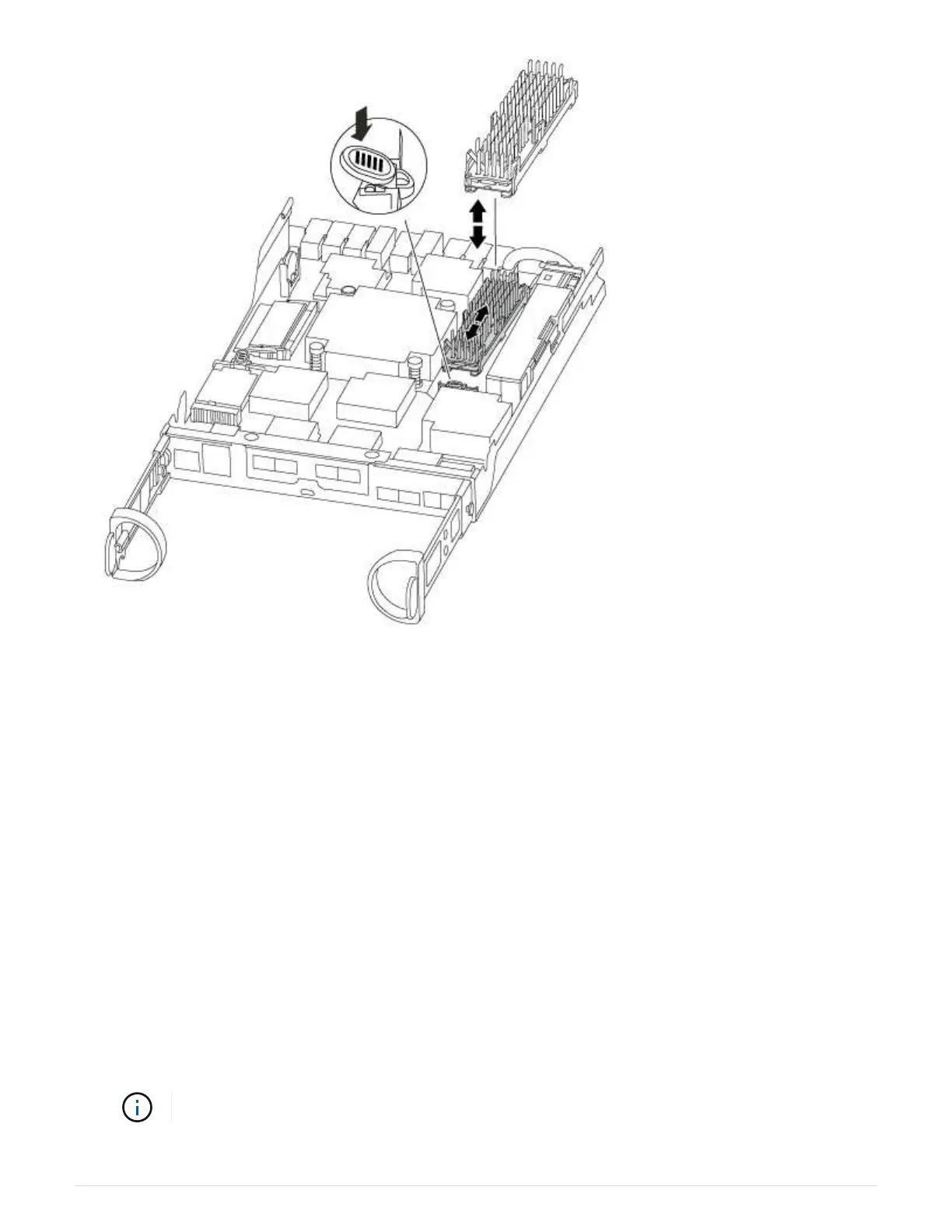 6. Reseat and push the heatsink down to engage the locking button on the caching module housing.